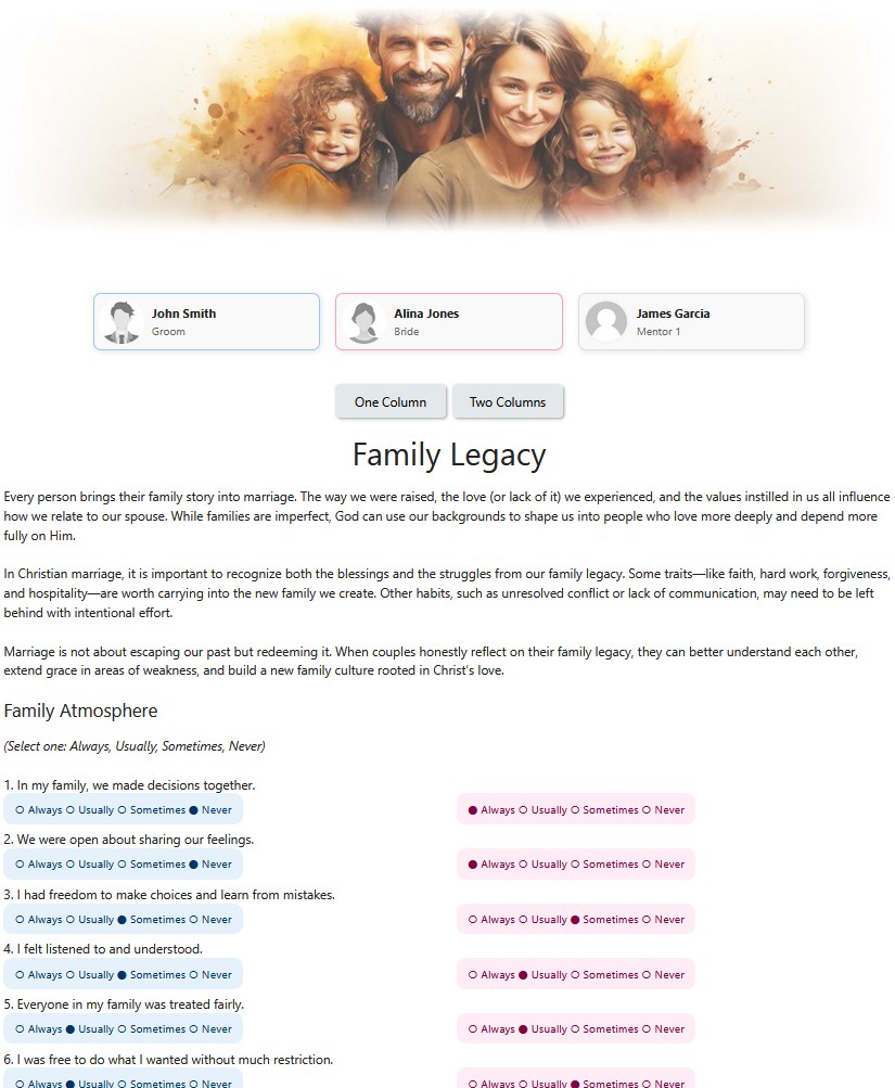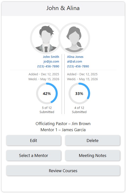 Chruch administrators, couples, and mentors can monitor quiz completion and overall progress throughout the program.